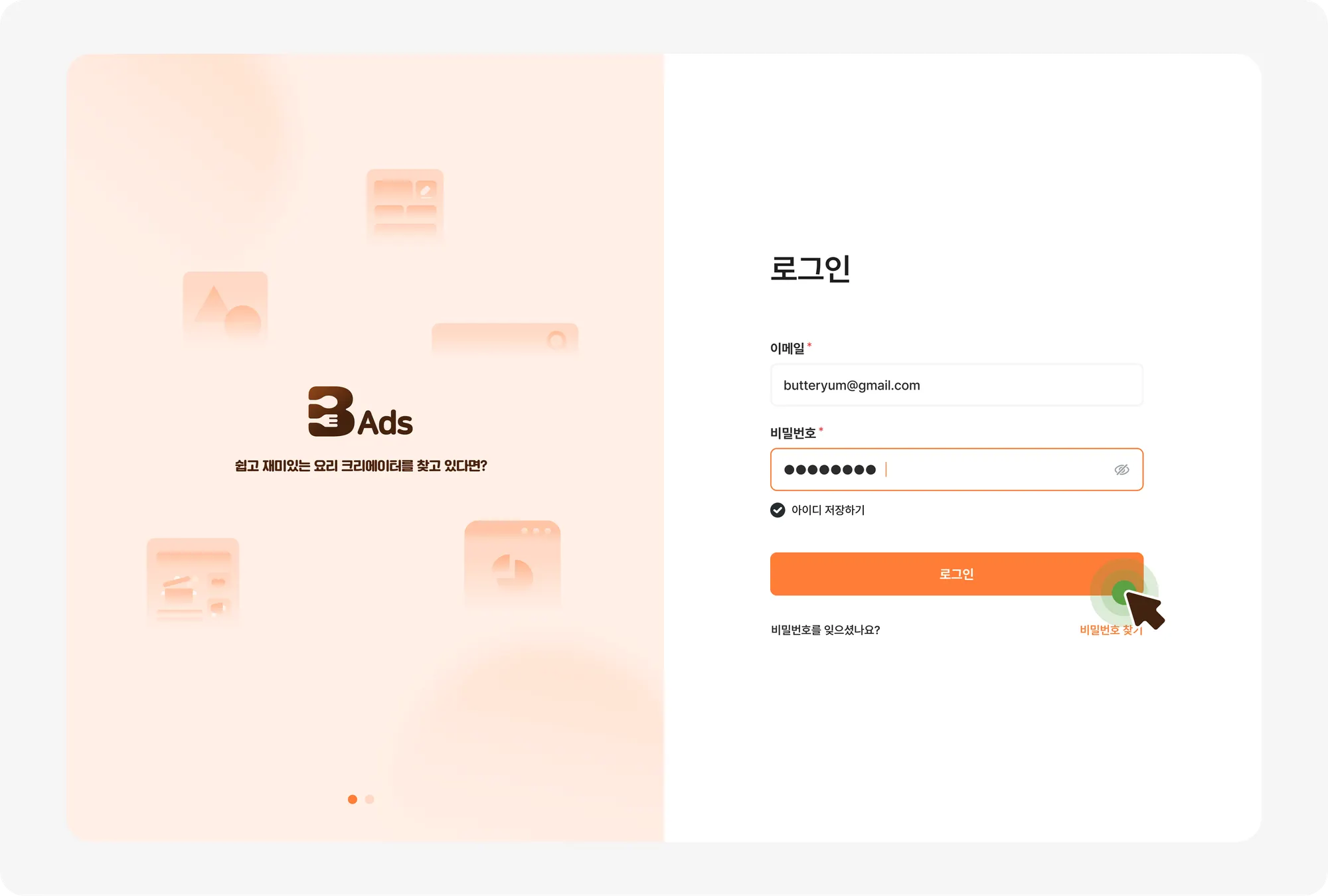 이메일(ID)과 버터얌 애즈 담당자가 전달한 임시 비밀번호로 로그인 해주세요.