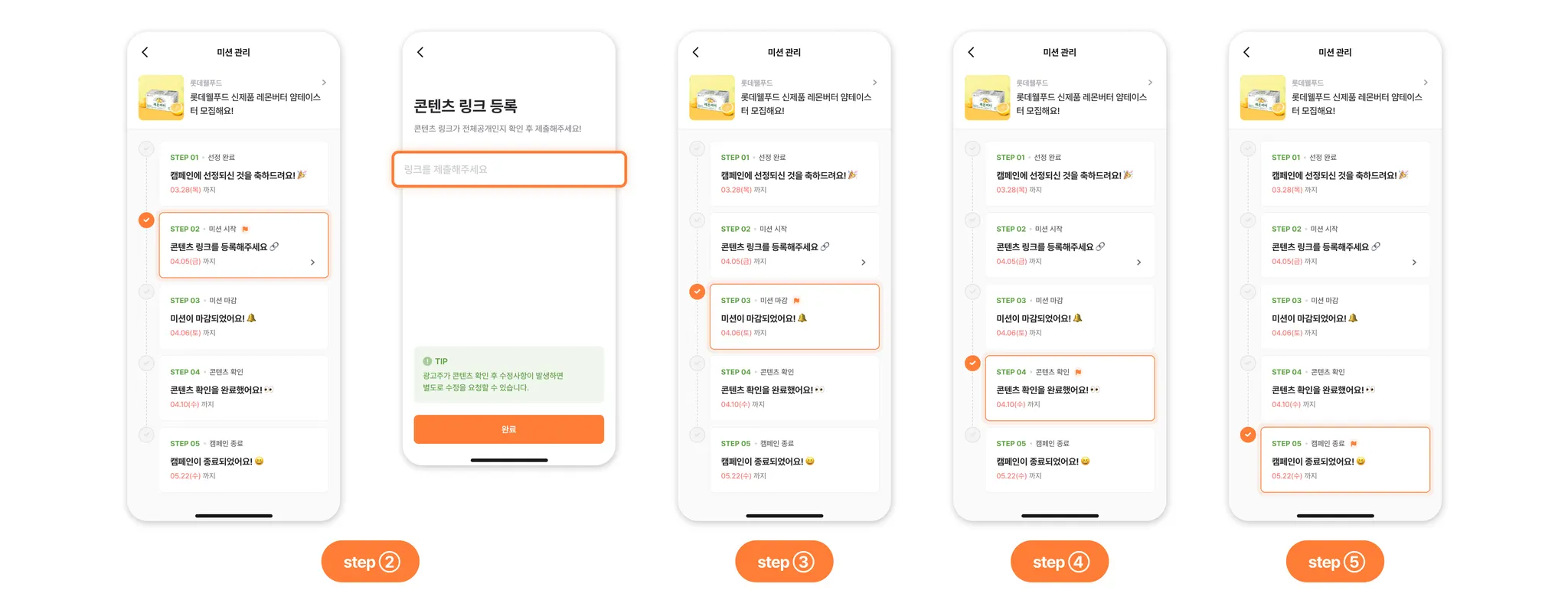 본인 SNS 계정에 업로드한 링크를 캠페인 → 미션관리 STEP 02에 콘텐츠 링크를 등록해주세요!